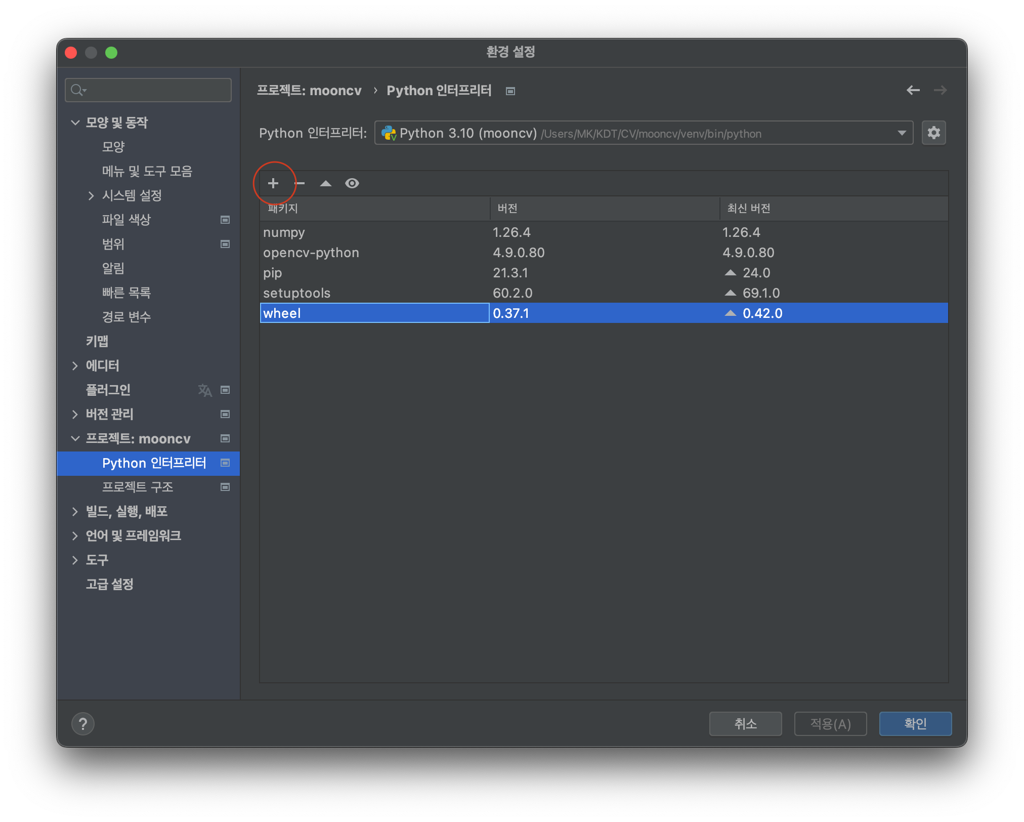 설정 탭의 사이드바에서 프로젝트:[프로젝트 이름] -> Python 인터프리터 로 이동합니다.